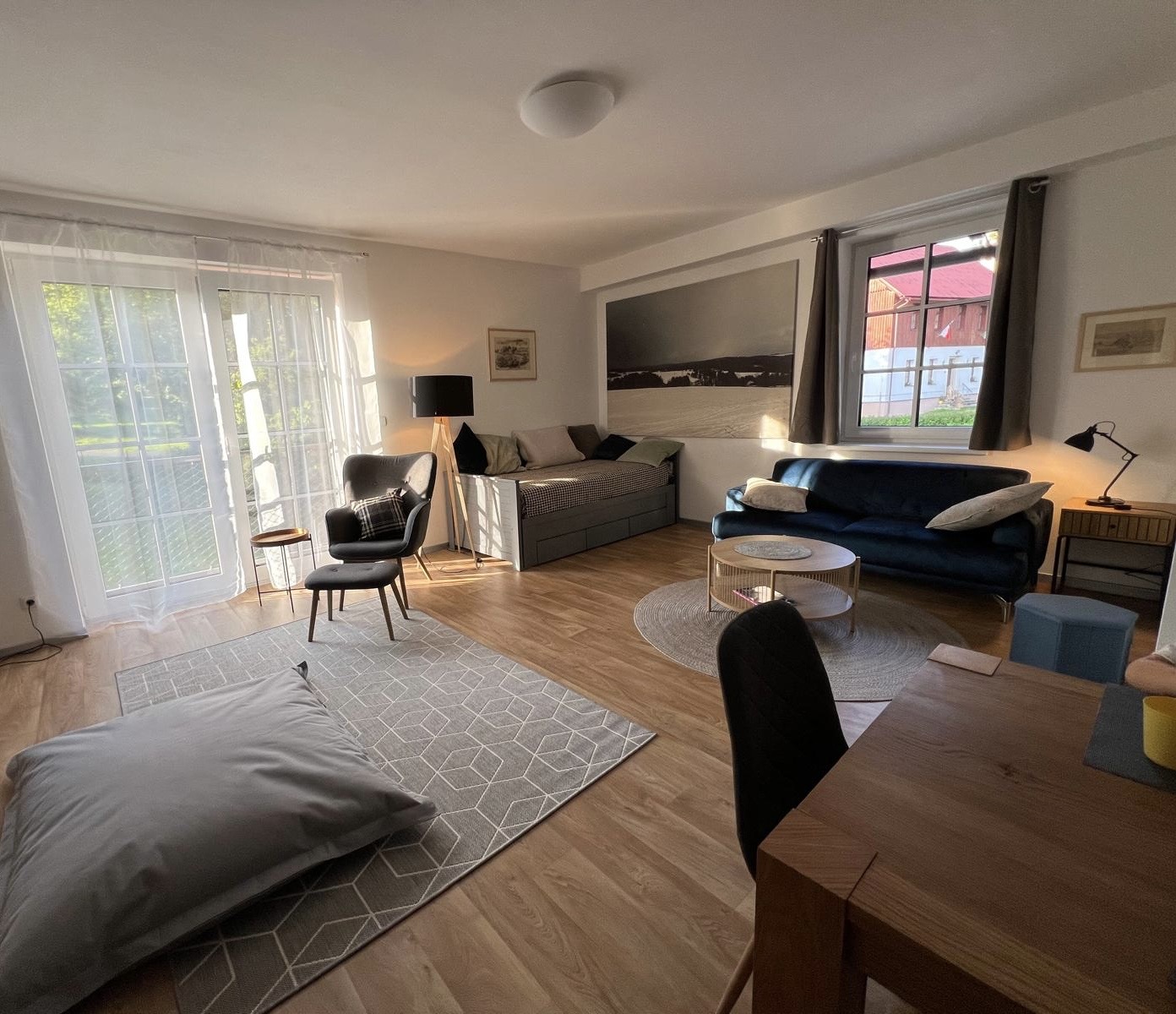 Apartmán je zařízen tak, abyste se v něm cítili příjemně po celou dobu vašeho pobytu. Apartmán je vhodný i pro větší rodinu s dětmi a nachází se ve 2. NP s výhledem na okolní krajinu. Jedná se o 2+kk s rozlohou 65 m² maximálně pro 4 osoby (5. osoba za poplatek navíc) a dítě do 2 let zdarma. V celém apartmánu je zabudováno podlahové vytápění, venkovní elektrické žaluzie, Wi-Fi, Chytrá TV s OnePlay, Netflixem aj. a vstupní kódový systém. Samozřejmostí je také lyžárna, kde hosté mají možnost využít vlastní lyžařský box s elektrickým vyhříváním bot a kolárna sloužící k uschování vlastních kol. Ložní prádlo a ručníky jsou v ceně apartmánu. Domácí mazlíčky jsou u nás vítání za menší poplatek. Zahrada je vám zcela k dispozici a můžete využít prostor pro posezení a grilování.